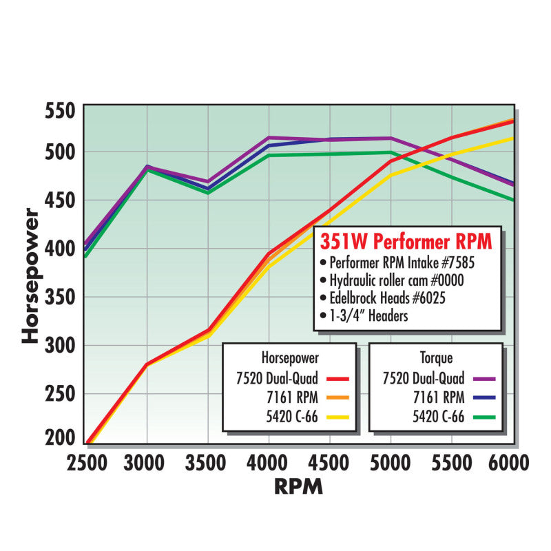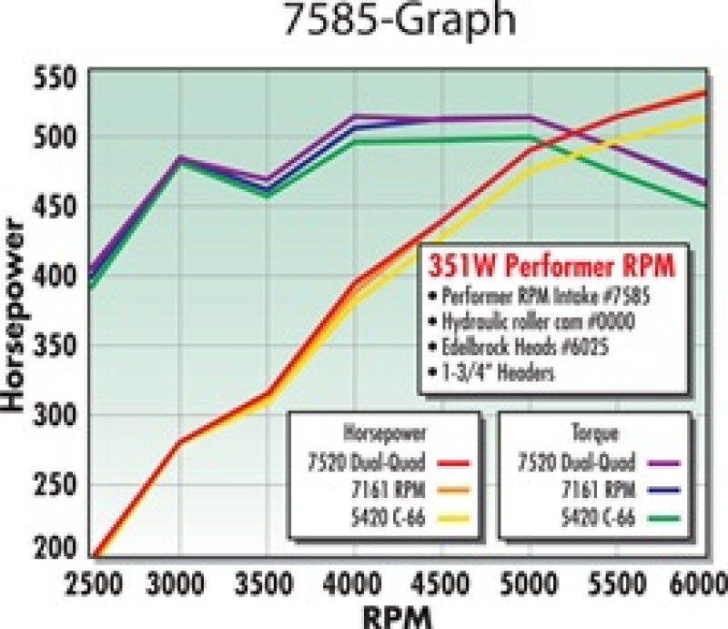 Edelbrock part #7585 RPM Air-Gap Dual-Quad 351W intake manifold is designed for 351W small-block Fords. This intake offers performance improvements in the 1500-6500 rpm range. The large runners feature our unique Air-Gap design that separates the runners from the hot engine valley for a cooler, denser charge and more horsepower. Includes bosses for rear water crossover. Carb center to carb center is 6-7/16".